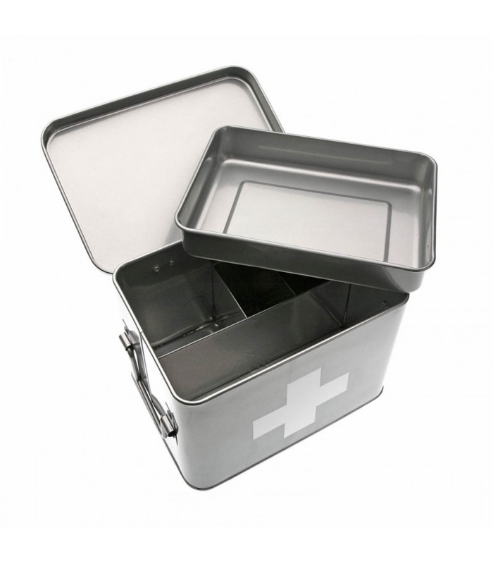 • Boîte métallique à message conçue pour le rangement de médicaments, de soins et d’instruments médicaux.